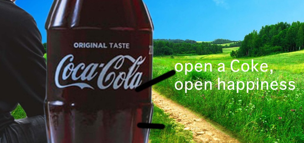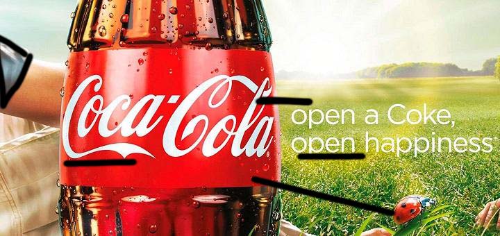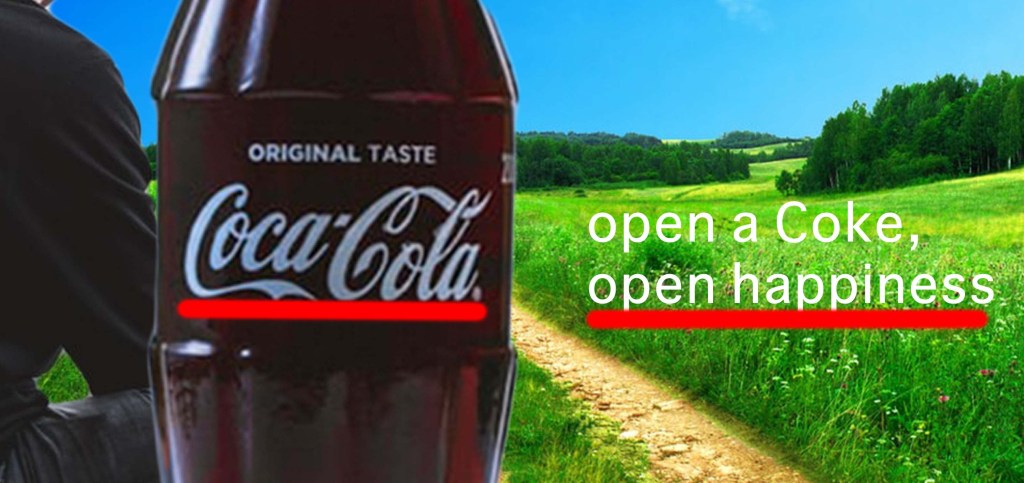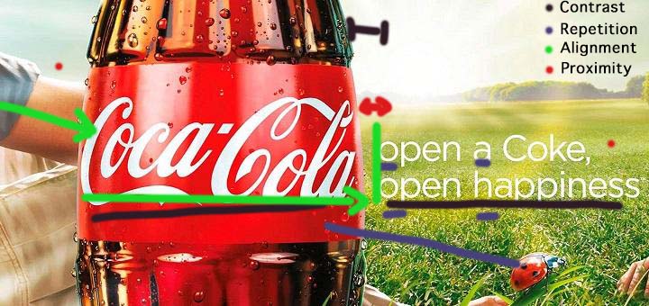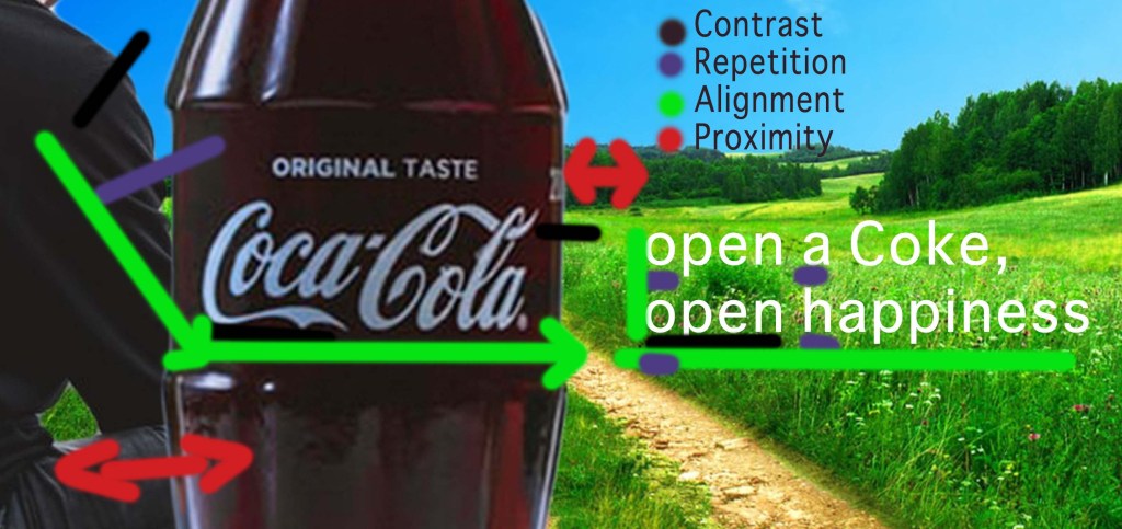 Proximity: The text is close to the logo but separated enough that you know they are different. The man is very close to the bottle, overlapping even, demonstrating a close relationship with the man and drinking Coke.